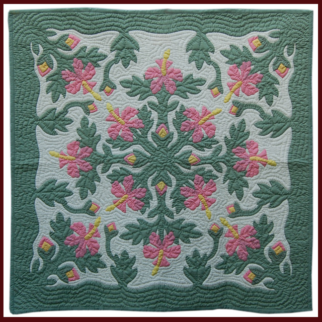 Each wall hanging is hand quilted by Master Quilters taught in the traditional Hawaiian style of quilting. Each Quilt has over 250,000 stitches and average 6-8 stitches per inch. We appliqué the design using the hidden or "blind" stitch onto the background material. It is then quilted with a ripple or echo pattern. Every piece is hand made with great care to insure your total satisfaction. Please contact us for availability and special orders (at NO EXTRA COST!).
