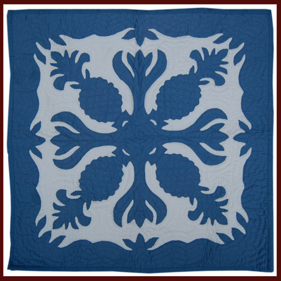 Each wall hanging is hand quilted by Master Quilters taught in the traditional Hawaiian style of quilting. Each Quilt has over 250,000 stitches and average 6-8 stitches per inch. We appliqué the design using the hidden or "blind" stitch onto the background material. It is then quilted with a ripple or echo pattern. Every piece is hand made with great care to insure your total satisfaction. Please contact us for availability and special orders (at NO EXTRA COST!).