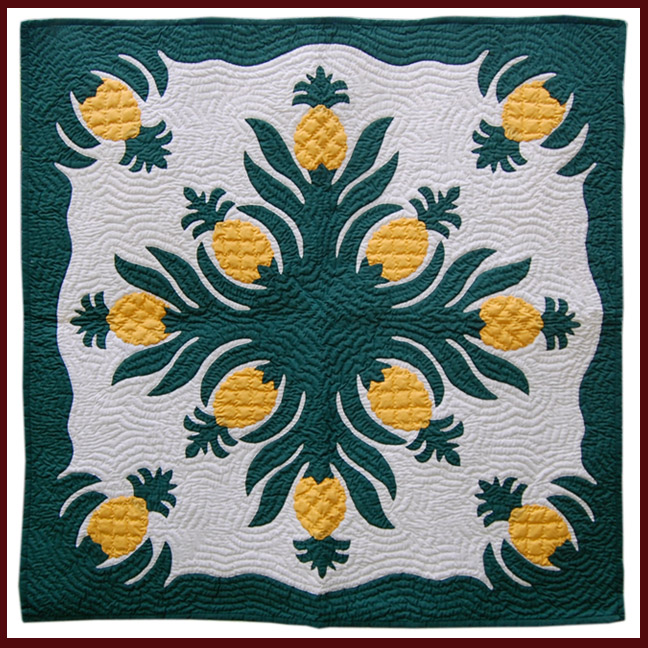 Each wall hanging is hand quilted by Master Quilters taught in the traditional Hawaiian style of quilting. Each Quilt has over 250,000 stitches and average 6-8 stitches per inch. We appliqué the design using the hidden or "blind" stitch onto the background material. It is then quilted with a ripple or echo pattern. Every piece is hand made with great care to insure your total satisfaction. Please contact us for availability and special orders (at NO EXTRA COST!).