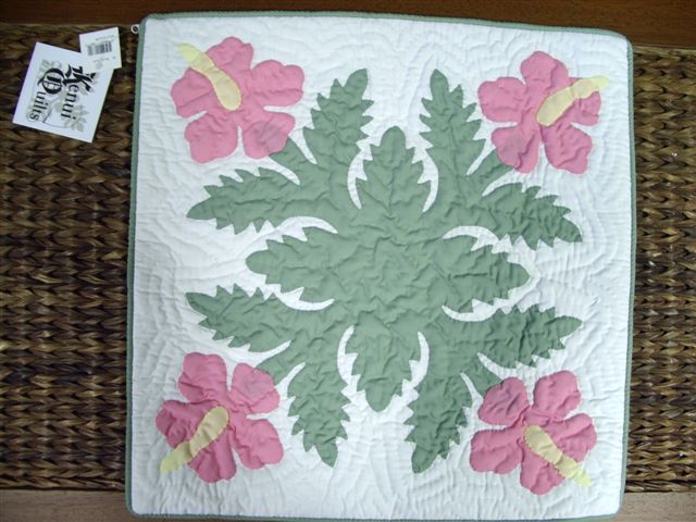 PINK HIBISCUS Hawaiian Quilted Pillow Cover. Hand Made Quilt