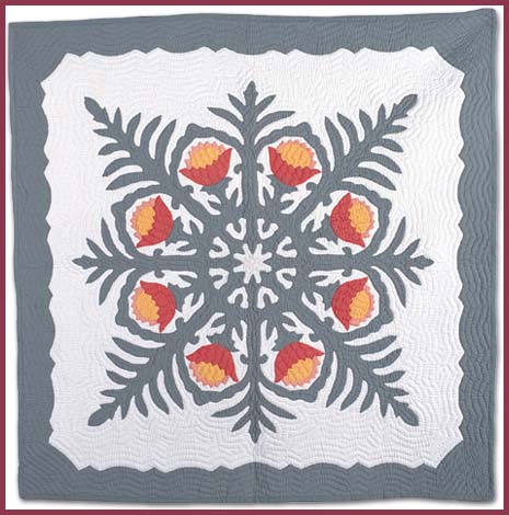 Each wall hanging is hand quilted by Master Quilters taught in the traditional Hawaiian style of quilting. Each Quilt has over 250,000 stitches and average 6-8 stitches per inch. We appliqué the design using the hidden or "blind" stitch onto the background material. It is then quilted with a ripple or echo pattern. Every piece is hand made with great care to insure your total satisfaction. Please contact us for availability and special orders (at NO EXTRA COST!).