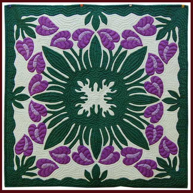 Each wall hanging is hand quilted by Master Quilters taught in the traditional Hawaiian style of quilting. Each Quilt has over 250,000 stitches and average 6-8 stitches per inch. We appliqué the design using the hidden or "blind" stitch onto the background material. It is then quilted with a ripple or echo pattern. Every piece is hand made with great care to insure your total satisfaction. Please contact us for availability and special orders (at NO EXTRA COST!).