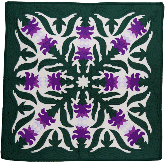 Each wall hanging is hand quilted by Master Quilters taught in the traditional Hawaiian style of quilting. Each Quilt has over 250,000 stitches and average 6-8 stitches per inch. We appliqué the design using the hidden or "blind" stitch onto the background material. It is then quilted with a ripple or echo pattern. Every piece is hand made with great care to insure your total satisfaction. Please contact us for availability and special orders (at NO EXTRA COST!).