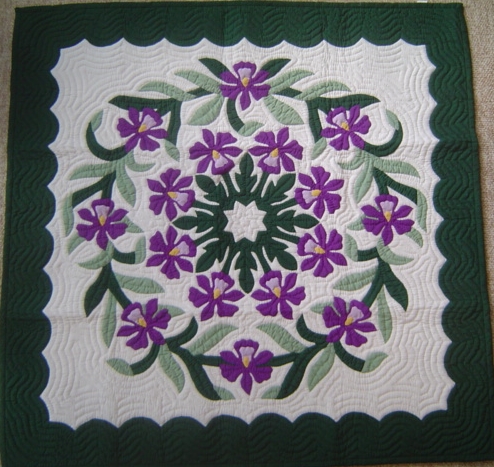 Each wall hanging is hand quilted by Master Quilters taught in the traditional Hawaiian style of quilting. Each Quilt has over 250,000 stitches and average 6-8 stitches per inch. We appliqué the design using the hidden or "blind" stitch onto the background material. It is then quilted with a ripple or echo pattern. Every piece is hand made with great care to insure your total satisfaction. Please contact us for availability and special orders (at NO EXTRA COST!).