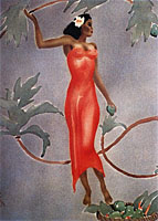 This incredibly popular airbrush image has become synonymous with nostalgia hawaiiana. GILL conveyed a sense of elegance and femininity in his work that is unsurpassed to this day. His talent and sensitivity is expressed in fully capturing the grace and beauty of the island wahine. His other vintage artwork depicts stylish art-deco images of hawaiian scenes, with titels such as Leimakers, Hawaiian Drummer, Hawaiian Fisherman, Hula Dancer etc.