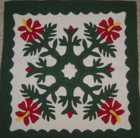 Each wall hanging is hand quilted by Master Quilters taught in the traditional Hawaiian style of quilting. Each Quilt has over 250,000 stitches and average 6-8 stitches per inch. We appliqué the design using the hidden or "blind" stitch onto the background material. It is then quilted with a ripple or echo pattern. Every piece is hand made with great care to insure your total satisfaction. Please contact us for availability and special orders (at NO EXTRA COST!).
