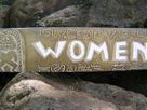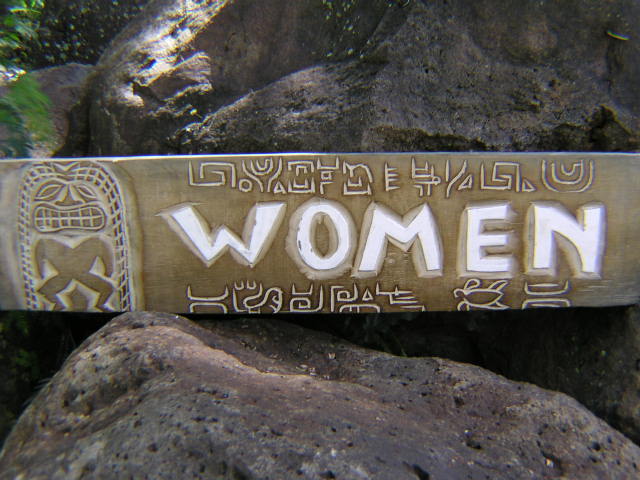 This is a hand made wooden "WOMEN" TIKI BAR sign with a antique/rustic finish, featuring petroglyph carvings and a carved Tiki on each side. Measurements: 31" x 7" (80 cm X 18 cm).