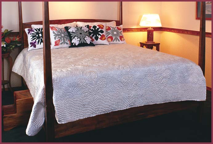 Each "Kapa" (Quilt in Hawaiian...) is hand quilted by Master Quilters taught in the traditional Hawaiian style of quilting. Each Quilt has over 250,000 stitches and average 6-8 stitches per inch. We appliqué the design using the hidden or "blind" stitch onto the background material. It is then quilted with a ripple or echo pattern. Every piece is hand made with great care to insure your total satisfaction and comes with matching pillow shams. Please contact us for availability and special orders (NO EXTRA COST!).