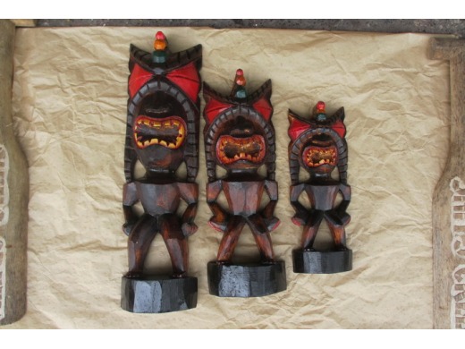 This trio of MONEY Tiki Gods are also the Tikis of strength, health and abundance. These Tikis were carefully hand carved and great attention has been paid to color and detail. They have each an antique finish which gives them a beautiful vintage look and smooth patina.