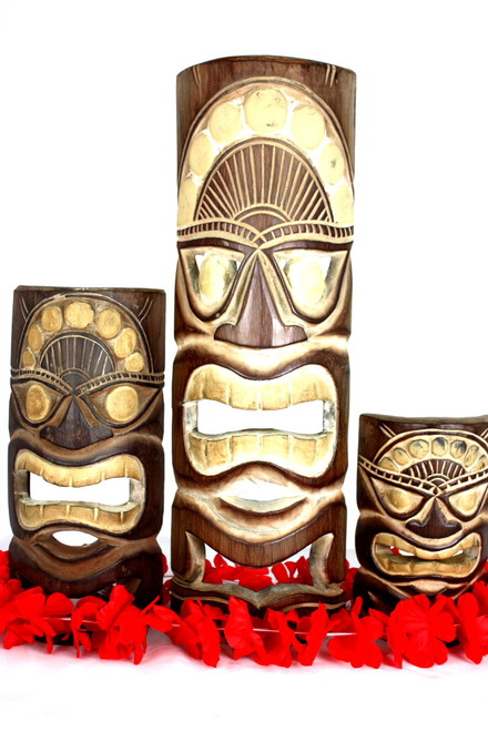Here is a set of 3 hand carved Tiki masks with a beautiful light brown finish and silver. These Kanaloa masks - Tiki of the ocean and abundance were hand carved with great attention to details (ready to hang!).