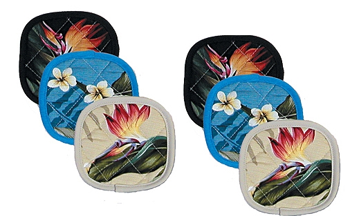 Details of each set: Six quilted coasters in a floral Bird of Paradise print. Two coasters in three classic colors: blue, beige and black. Measurement: 4.6" wide.
