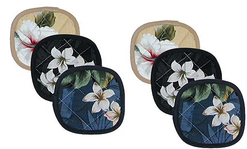 Details of each set: Six quilted coasters in a floral Hibiscus print. Two coasters in three classic colors: blue, beige and black.