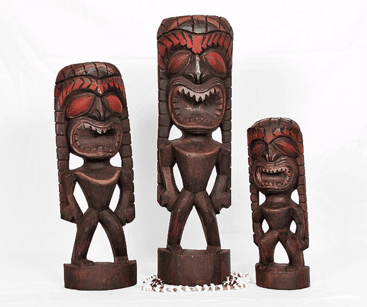 This trio of LUCKY Tiki Gods are also the Tikis of strength, health and abundance. These Tikis were carefully hand carved and great attention has been paid to color and detail. They have each an antique finish which gives them a beautiful vintage look and smooth patina.