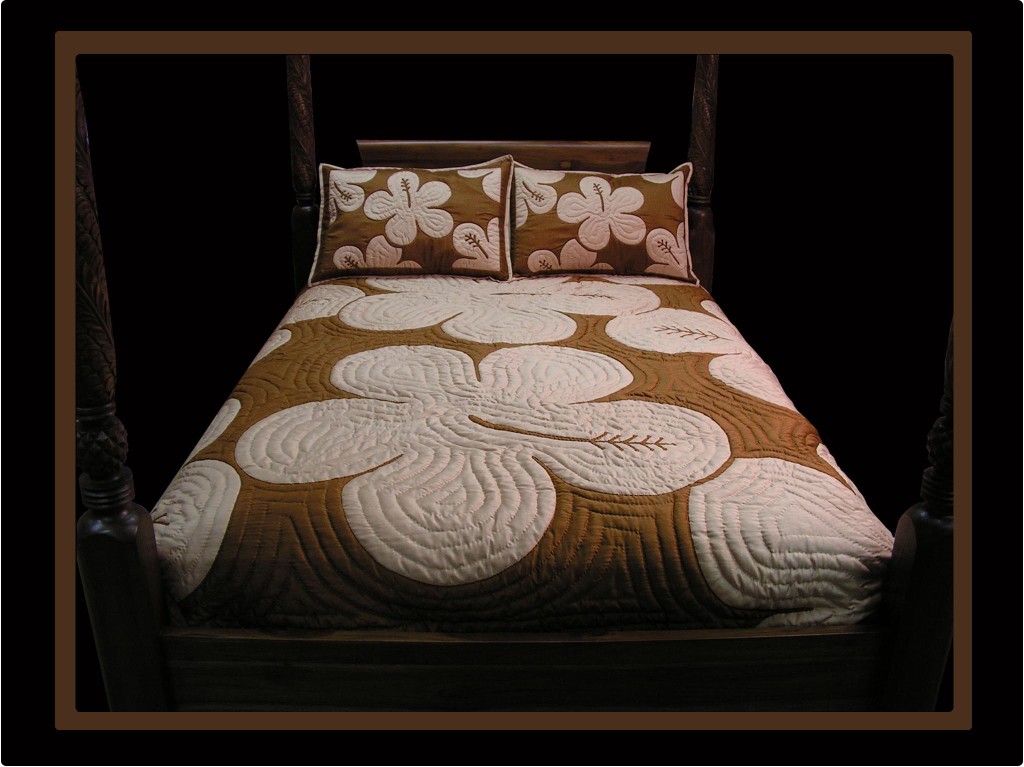 Our Fabrics of choice are an elegant “Super Fine” blend of Cotton and just enough Polyester to give that regal feel to the Quilt, while offering for the first time on the market a very elegant Shantung Silk Bed Quilt with a texture that will elevate your bedroom appeal to the status of Hawaiian Royalty!!!