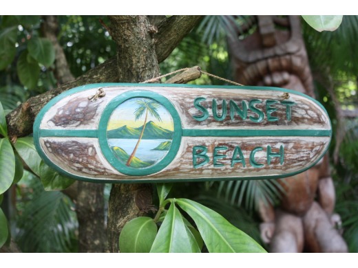 Here is a hand made vintage looking Tiki sign with the wording " SUNSET BEACH" and an exotic surfing scene, painted in bright colors on it. Each letter is hand carved and raised.