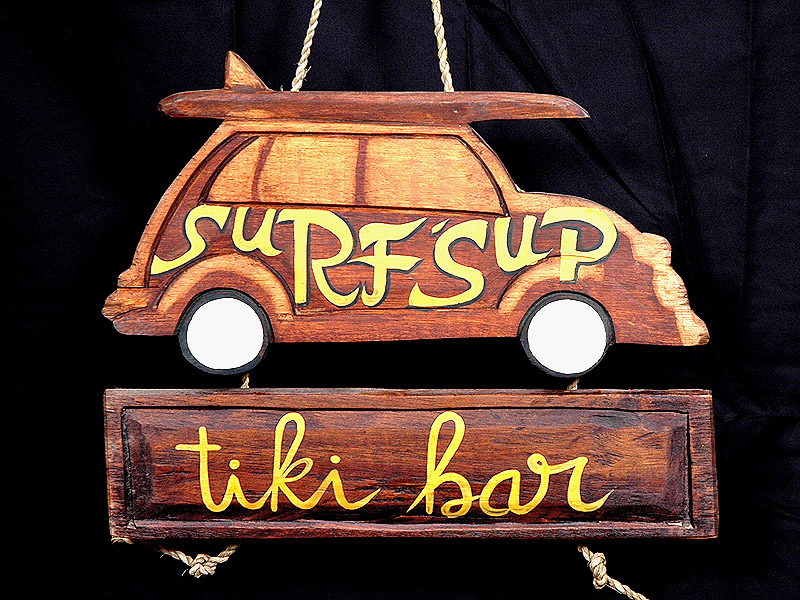 This is a hand made vintage looking "SURF'S UP" wooden "TIKI BAR" tiki sign. Each letter of SURF"S UP and "TIKI BAR" is hand carved and raised. The classic woody gives the sign a rustic feel and adds a distinctive old world touch. This great piece of handicraft measures 15 inches long by 10inches tall (38 cm x 25 cm).