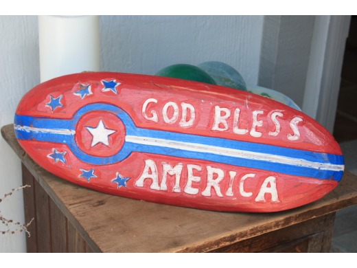 This is a hand made, Americana Surf Sign with the wording: "GOD BLESS AMERICA" The wood has been coated for durability which adds it's own artistic touch and rustic feel.