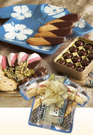Celebrate special occasions with our Taste of Aloha Gift Set. Better than a gift basket, our handcrafted ceramic Brushed Hibiscus Aloha Shirt Divided Tray beautifully displays an array of gourmet Hawaiian treats. From sweet Macadamia Caramel Chocolates to rich dark chocolate kona coffee truffles, this Taste of Aloha Gift Set makes the perfect gift!