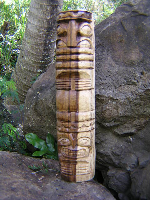 This is a hand carved Tahitian Tiki totem depicting 2 deities. This Tiki totem has a double meaning, love and prosperity, which can be distinguised by the set of eyes going upward and downward.