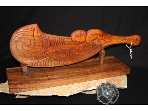 This is an authentic MAORI War Club featuring Tiki God KU, Tiki of Strength. This beautiful and yet intimidating piece of art measures 24" long. It was hand carved from Hawaiian ACACIA KOA WOOD - a strong and dense wood, known for its beautiful grain.