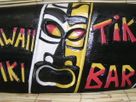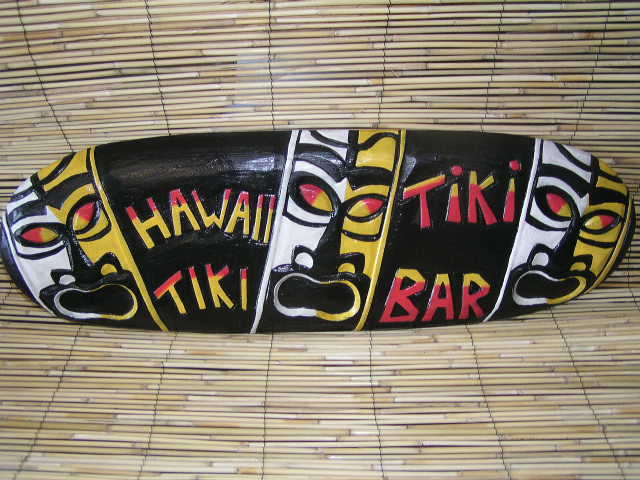 This is a hand made, retro Hawaiian style "TIKI BAR" tiki hut sign featuring carved tikis on the side. The wood has been hand painted for durability which adds it's own artistic touch and rustic feel. The sign meaures: 8" high x 20" wide. It comes ready to hang.