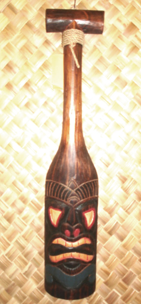 Here is an artfully designed Tiki paddle that was hand carved and hand painted with geat attention to details. It has a carved tiki mask on the blade. It has an an antique finish which gives it a beautiful vintage look. Measurement: 21" X 5"