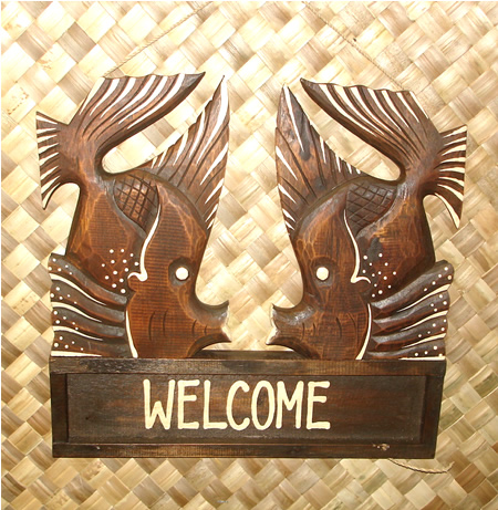 This is a hand made, retro Hawaiian carved wood "WELCOME" tiki bar sign. It is flanked by two kissy fish. The sign has been hand carved with great attention to detail and has a very artistic touch and rustic feel. This great piece of handicraft measures 15 inches wide by 14 inches tall. It comes ready to hang with 2 hooks in the back.