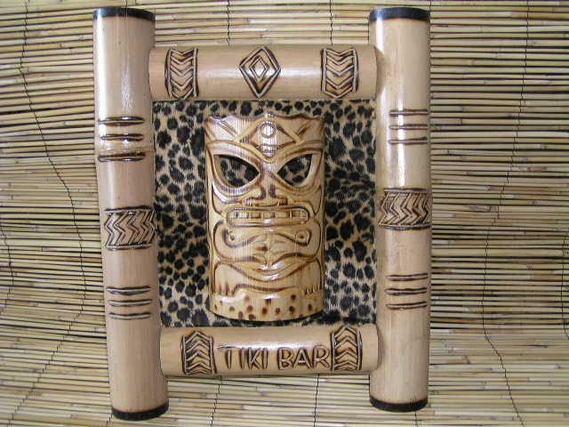 This retro tiki sign was hand made and has a bamboo frame, backed with a retro style, leopard print backing.