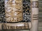 This is a hand made, bamboo Tiki bar sign with the wording "TIKI BAR". It also features a carved tiki mask.