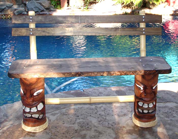 * Other specifications: a greatat fire ring bench for that warm tropical feel. Comfortably seats 2 adults. This bench has a back rest. It also features two 20" Hand carved tiki statues with rope and hand carved detail. The bench has carved edges and 2 1/2" bamboo for support. The bench comes ready stained and with a coat of poly-urethane.