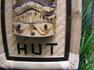 This is a hand made, bamboo Tiki bar sign with the wording "TIKI HUT". It also features a carved tiki mask.