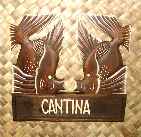 This is a hand made, retro Hawaiian carved wood "CANTINA" tiki bar sign. It is flanked by two kissy fish. The sign has been hand carved with great attention to detail and has a very artistic touch and rustic feel. This great piece of handicraft measures 15 inches wide by 14 inches tall. It comes ready to hang with 2 hooks in the back.