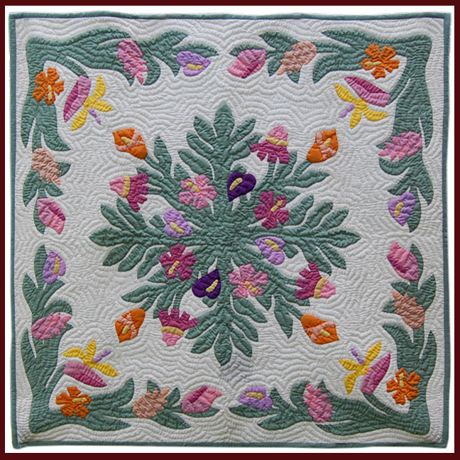 Each wall hanging is hand quilted by Master Quilters taught in the traditional Hawaiian style of quilting. Each Quilt has over 250,000 stitches and average 6-8 stitches per inch. We appliqué the design using the hidden or "blind" stitch onto the background material. It is then quilted with a ripple or echo pattern. Every piece is hand made with great care to insure your total satisfaction. Please contact us for availability and special orders (at NO EXTRA COST!).