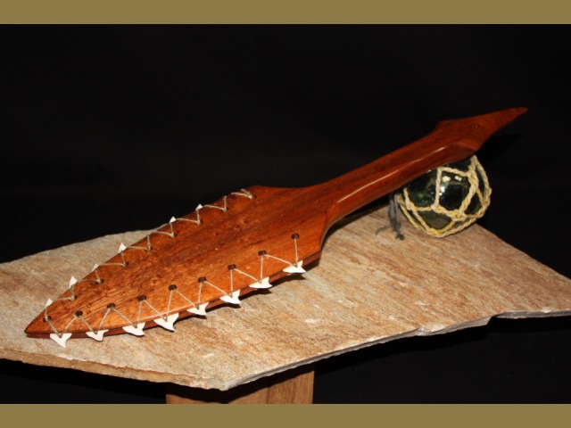 This is an authentic Hawaiian solid KOA WOOD LEI O MANO CLUB with a diamond shaped tip and intimidating shark teeth. This beautiful piece of art measures 18" long and 6.5" wide with a total of 16 real tiger shark teeth. It is hand carved from rare Curly Koa wood. From the pictures one can appreciate the attention to details and the smooth patina of the wood.