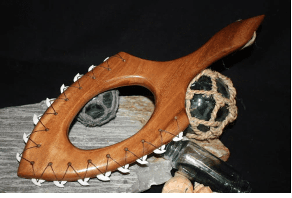 This is an authentic Hawaiian KOA War Club with intimidating shark teeth. This beautiful piece of art measures 19" long and 7" wide with a total of 16 real tiger shark teeth. It is hand carved from rare solid Koa wood and has woven loops of fibers also called "olonai", a Hawaiian shrub, the bark of which is valued for its strong, durable fiber. From the pictures one can appreciate the attention to details and the smooth patina of the wood.