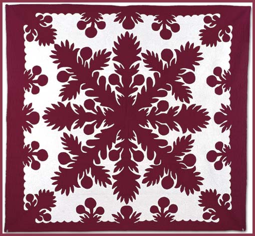 Hawaii’s most popular design. The Ulu (Breadfruit) design is very traditional because of the significance to the Hawaiian people. Symbolizing good luck, the Ulu - a food pattern - is often the first design a quilter will do when learning how to quilt and when celebrating a "first". It is often given as gifts for weddings, birthdays and graduation ceremonies. The Ulu design definately is our top seller here in Hawaii. Available in any color combination you prefer; the more traditional color is the deep Hunter Green. It looks fantastic with rich wood furniture, for the hardcore Hawaiian this is a must for a Koa Bed.