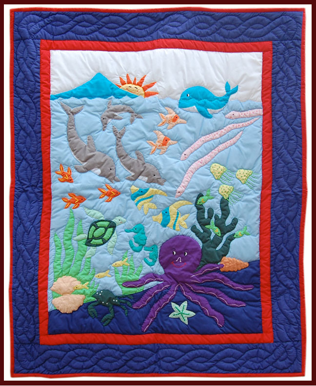This is a beautifully hand stitched Hawaiian baby quilt. The UNDER THE SEA theme features some extraordinary underwater scenes from the Hawaiian islands which are appliqued and embroidered. Note the octopus, the happy whale, the tropical fish, parrot fish, dolphin, turtles (a symbol of longevity in the pacific isles), jellyfish, etc. Who would not want to wake up in the nursery with these friendly ocean friends?