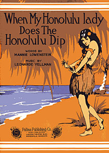 This vintage sheet music cover (ca.1927) for the song "When my Honolulu Lady does the Honolulu Dip" portrays the Hawaiian spirit of Aloha, which is still very much alive in the islands today. It depicts a graceous wahine in a grass skirt with outstreched, welcoming hands, swaying her hips to the music and wearing flower leis.