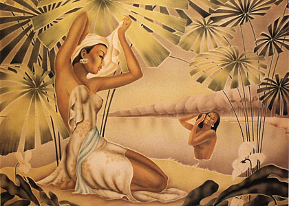 This incredibly popular airbrush image has become synonymous with nostalgia hawaiiana. GILL conveyed a sense of elegance and femininity in his work that is unsurpassed to this day. His talent and sensitivity is expressed in fully capturing the grace and beauty of the island wahine. His other vintage artwork depicts stylish art-deco images of hawaiian scenes, with titels such as Leimakers, Hawaiian Drummer, Hawaiian Fisherman, Hula Dancer etc.