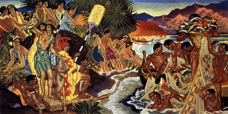 In 1940, Eugene Savage completed, nine 8'x 4' murals for the Matson Shipping Lines. They were not used until1 1948 - after the war - when nine-color lithographed menu covers based on these designs appeared on the company’s flagship LURLINE. Today, Savage’s art is regarded the finest that the period produced. This is a high quality Giclee art print, reproduced on 80 lbs Premium Linen Paper and measures 14"x28".