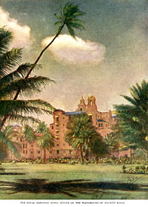 This menu cover (Ca.1935) is from "Paradise of the Pacific" magazine portraying the famous ROYAL HAWAIIAN HOTEL - also lovingly referred to as the pink hotel - on Waikiki Beach.