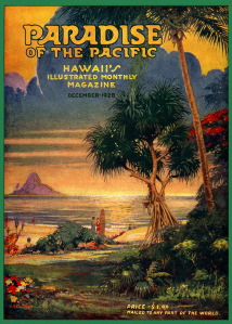 Hawaii has always been synonomous with surf and sun... This PARADISE OF THE PACIFIC cover by H.B. Christian, ca. 1928 shows a lively beach scene with a surfer holding a classic longboard and beachgoers enjoying the sunset. In the background, Chinaman's Hat Island can be seen along with the palmtrees, surf and beautiful sunsets which Hawai'i is so famous for. One of our most popular images.