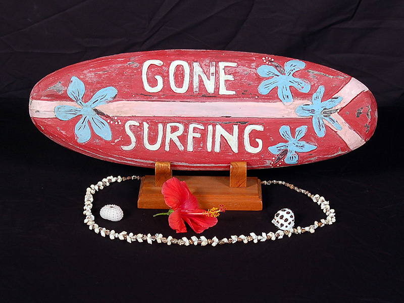 Here is a hand made vintage looking Tiki sign with the wording "GONE SURFING" painted in bright colors on it. Each letter of Gone Surfing is hand carved and raised. This great piece of handicraft measures 20 inches long by 6 inches wide (50 cm X 15cm).