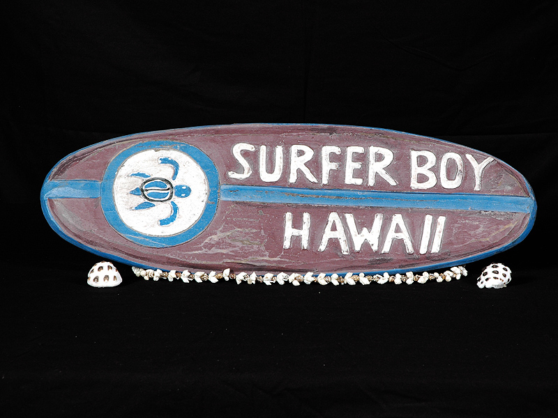 Here is a hand made vintage looking Tiki sign with the wording "SURFER BOY HAWAII" painted in bright colors on it. Each letter of Surfer Boy and Hawaii is hand carved and raised. This great piece of handicraft measures 20 inches long by 6 inches wide (50 cm X 15cm).