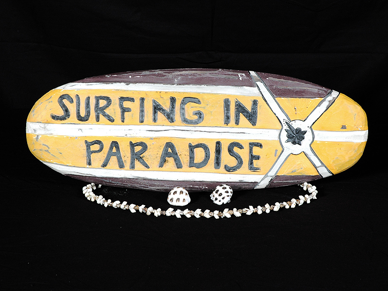 Here is a hand made vintage looking Tiki sign with the wording "SURFING IN PARADISE" painted in bright colors on it. Each letter of SURFING and IN PARADISE is hand carved and raised. This great piece of handicraft measures 20 inches long by 6 inches wide (50 cm X 15cm).