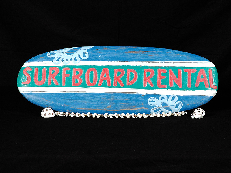 Here is a hand made vintage looking Tiki sign with the wording "SURFBOARD RENTAL" painted in bright colors on it. Each letter of Surfboard Rental is hand carved and raised.