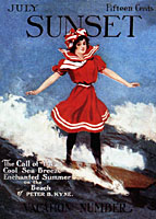 Hawaii has always been synonomous with surf and sun... No wonder surfing themes have been so popular to entice visitors to the islands. True to the spirit of Hawai'i, this SUNSET MAGAZINE Cover, features a surfer girl on a classic long board, riding the Waikiki waves...albeit a bit comical in her mainland attire.