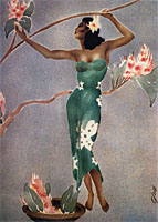 This incredibly popular airbrush image has become synonymous with nostalgia hawaiiana. GILL conveyed a sense of elegance and femininity in his work that is unsurpassed to this day. His talent and sensitivity is expressed in fully capturing the grace and beauty of the island wahine. His other vintage artwork depicts stylish art-deco images of hawaiian scenes, with titels such as Leimakers, Hawaiian Drummer, Hawaiian Fisherman, Hula Dancer etc.