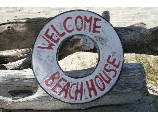 Here is a whimsical Hawaiian vintage beach/cottage style WELCOME BEACH HOUSE nostalgia welcome sign in rustic coastal colors featuring a girl on the beach.