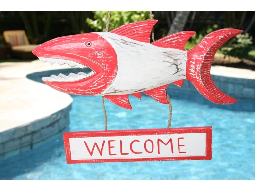 Here is very cute "WELCOME" Shark Attack wooden sign in blue / red / yellow coastal colors! The sign has been hand carved and hand painted, great piece of home decoration!